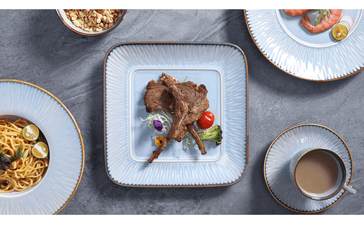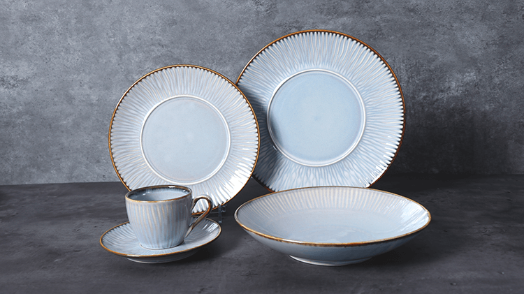 Geprägtes Bone China-Geschirr mit goldenem Aufkleber.