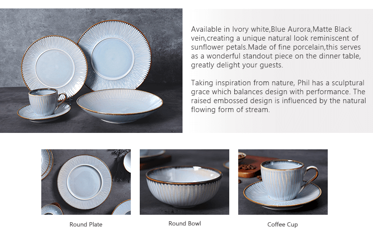 Erhältlich in den Farben Elfenbeinweiß, Aurorablau und mattschwarze Ader, wodurch ein einzigartiger natürlicher Look entsteht, der an Sonnenblumenblütenblätter erinnert. Aus feinem Porzellan gefertigt, dient es als wunderbarer Blickfang auf dem Esstisch und wird Ihre Gäste sehr erfreuen.Phil lässt sich von der Natur inspirieren und verfügt über eine skulpturale Anmut, die Design und Leistung in Einklang bringt.Das erhabene Prägedesign ist von der natürlichen fließenden Form eines Baches beeinflusst.