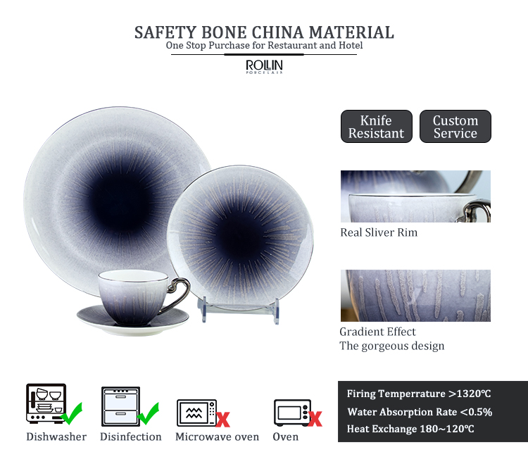 Blaues und weißes Bone China-Geschirrset, Hotellieferant
